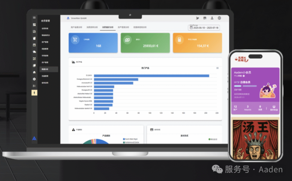 打开手机端“Aaden管家”,首页直接查看当前客流、畅销菜品和营收状况。系统提供“数据看板”,清晰展示套餐销售占比、高峰时段客流曲线及外卖订单趋势,让您对经营状况一目了然。